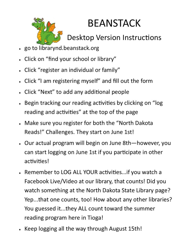 Our program here at the Tioga Community Library will actually begin Monday, June 8th; HOWEVER, North Dakota State Library starts TOMORROW! Check out their Facebook page for all sorts of great activities starting tomorrow…and LOG them into your BEANSTACK program – EVERYTHING you do counts toward our program here, too!